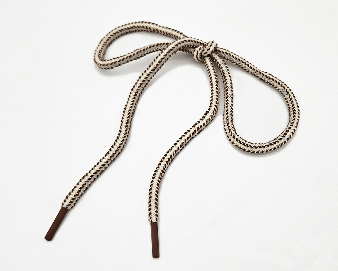 Recycled polycotton + silicone-coated metal aglets.