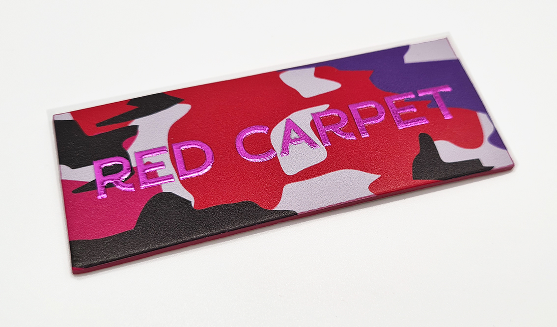Genuine leather patch with camouflage printed background and logo printed in fuchsia metallized col.