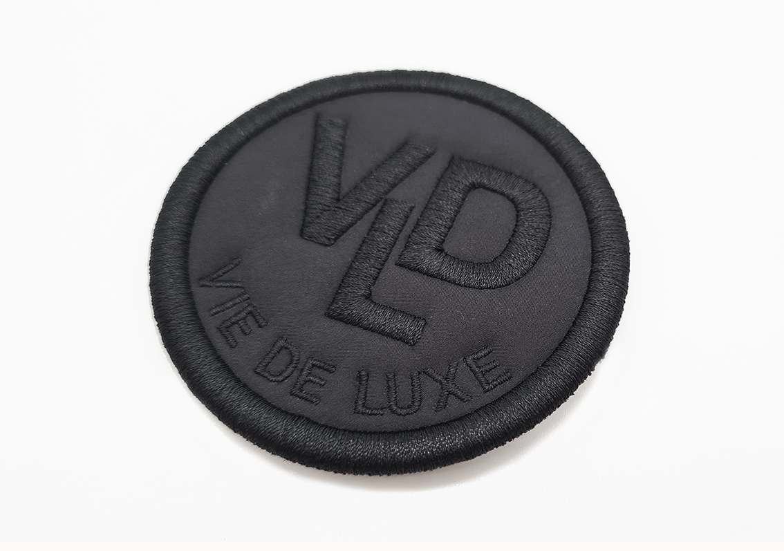 Matt black nylon patch with relief embroidery in shiny black col.