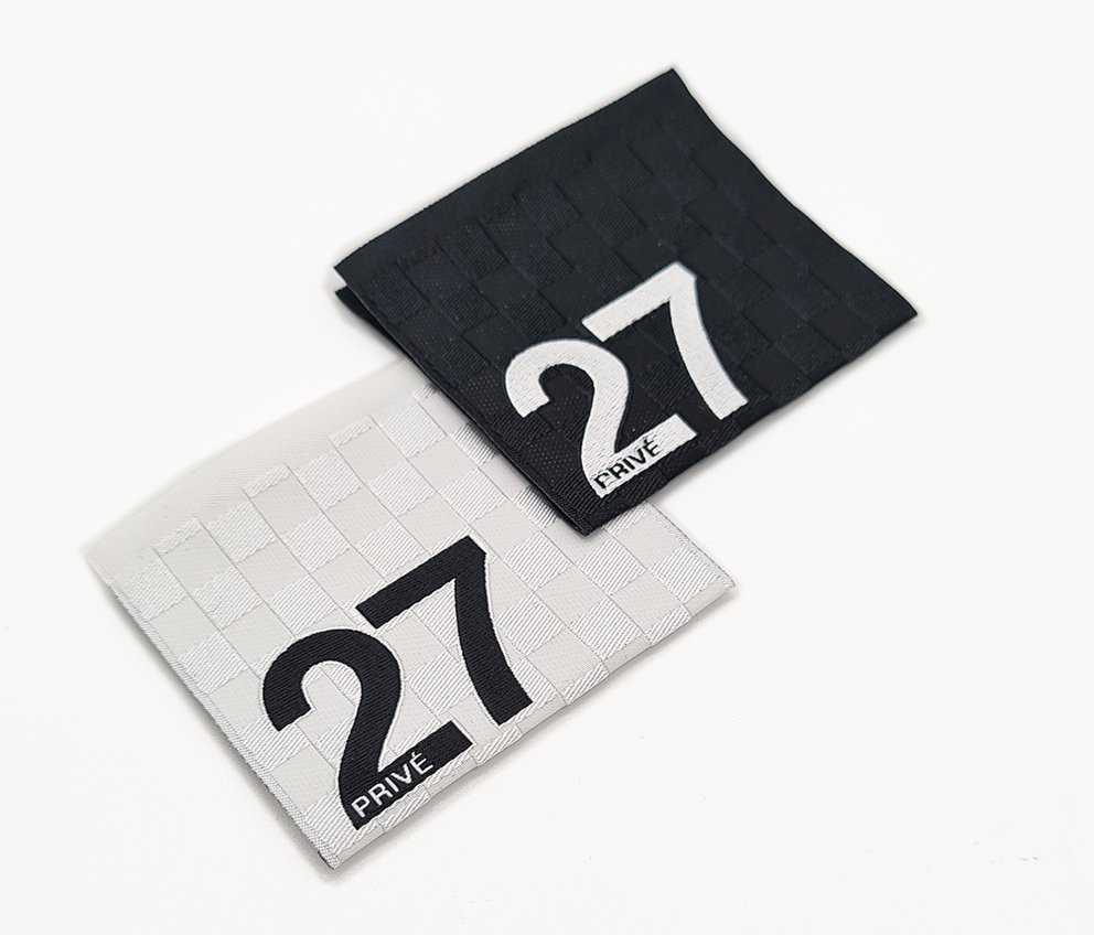 Woven labels with checkered background made with shiny/matt contrast and double brocade woven logo.