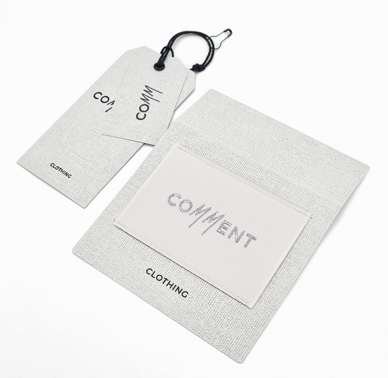 Double tag, both made with textured paper, logo printed in glossy black.