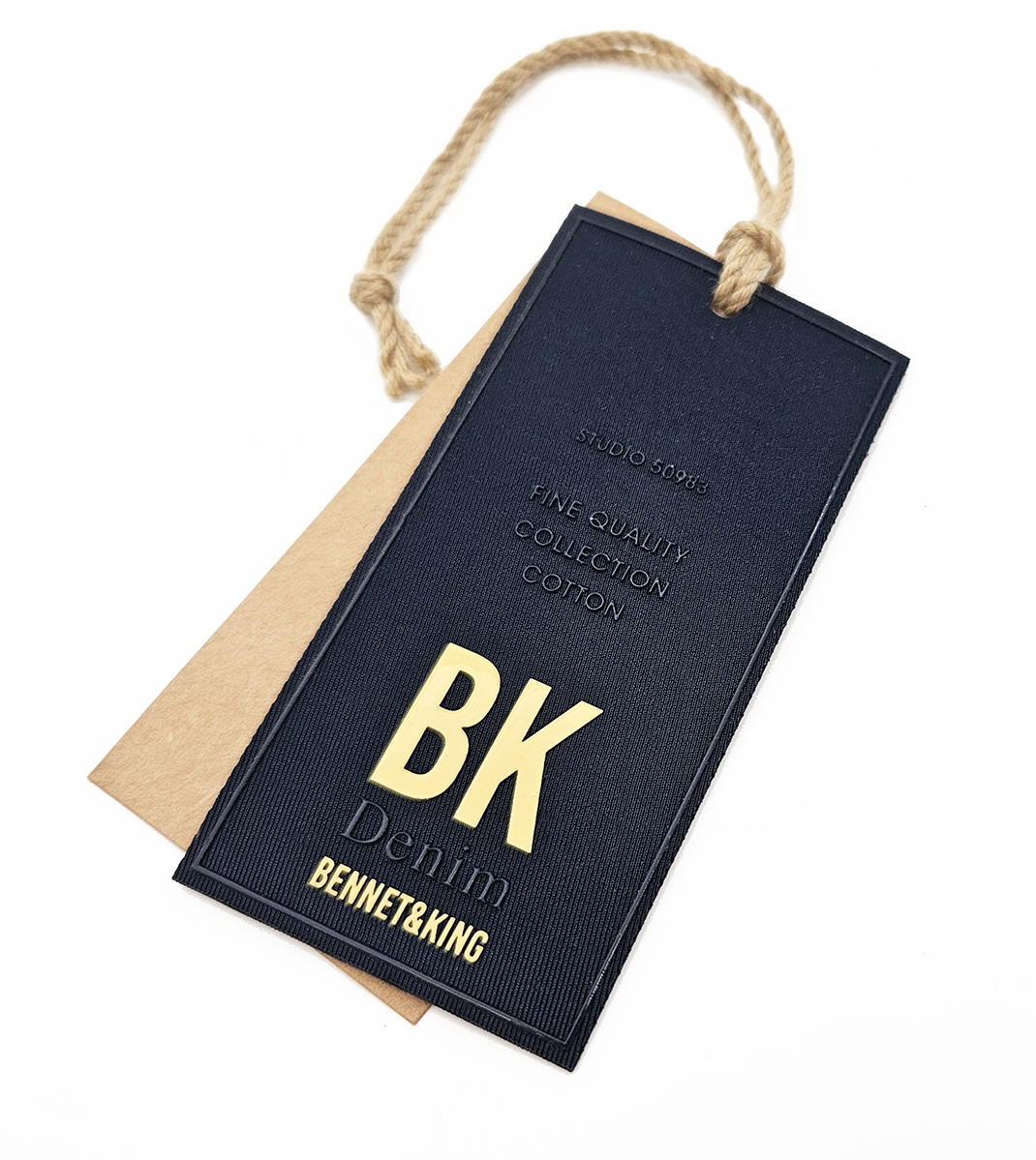 Fabric tag with shiny embossed silicone logos, service tag in rough-brown paper. Threading with soft “twisted” string, in col. brown