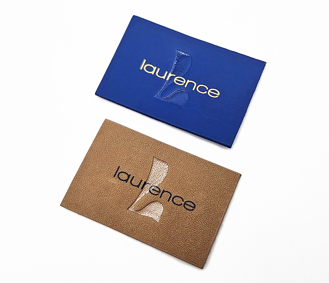 Genuine leather labels with shiny debossed logo and 1 col. print logo.