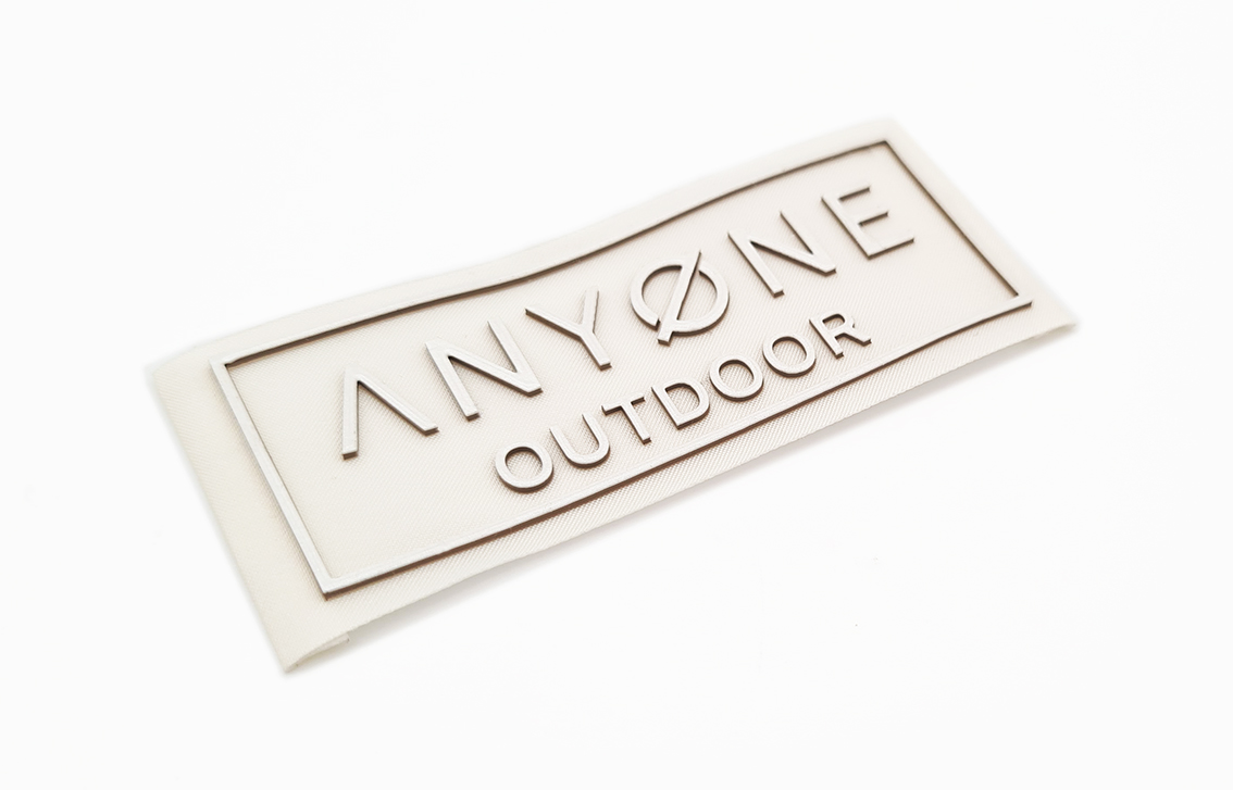 Off white background woven label with logo and frame in silicone in two-color embossing microinjection