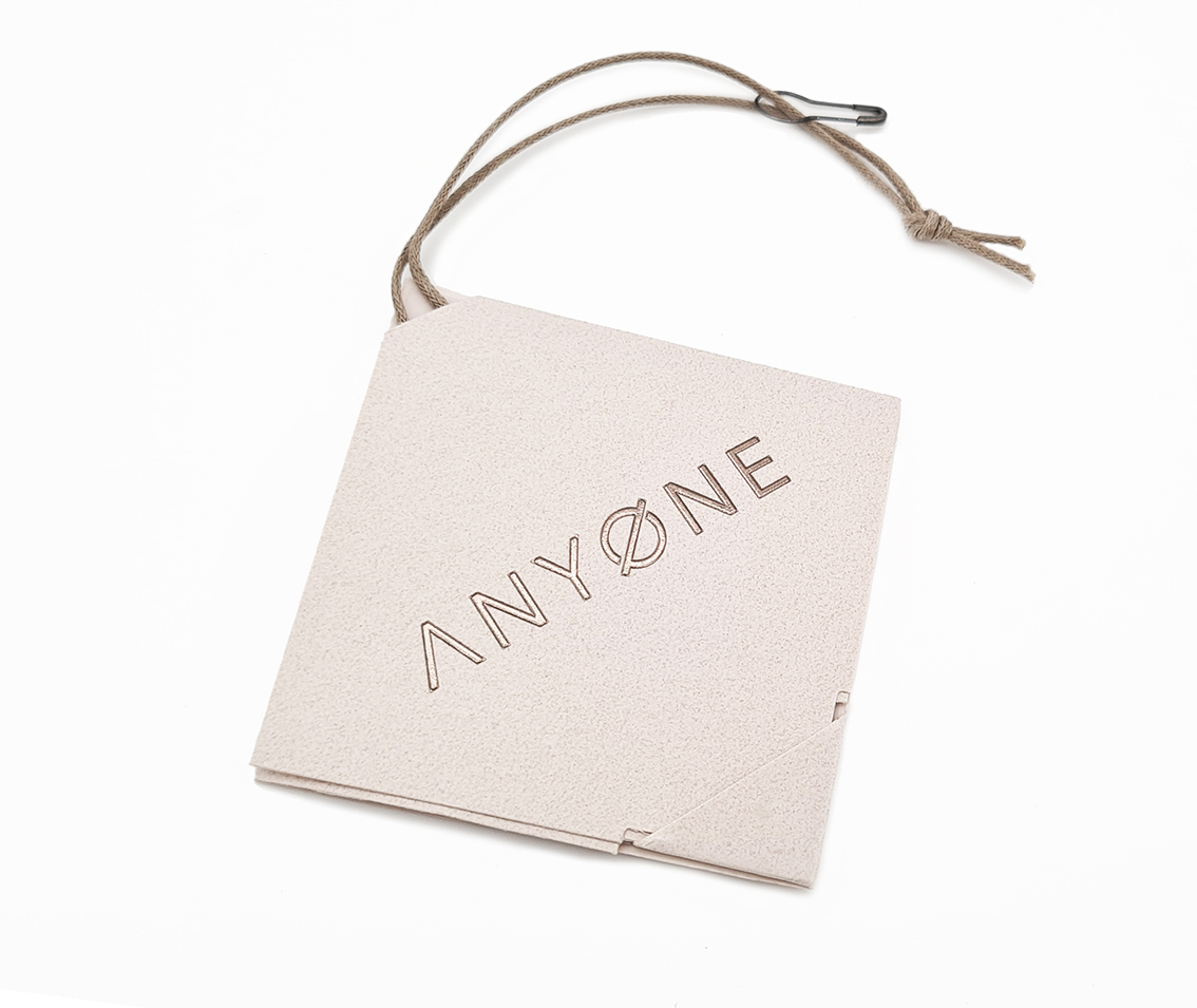 Tag in “cement” textured paper in col. mist pink, embossed logo in metallic foil col. gunmetal, folded like origami, reveals brand information with a surprising and creative design.
