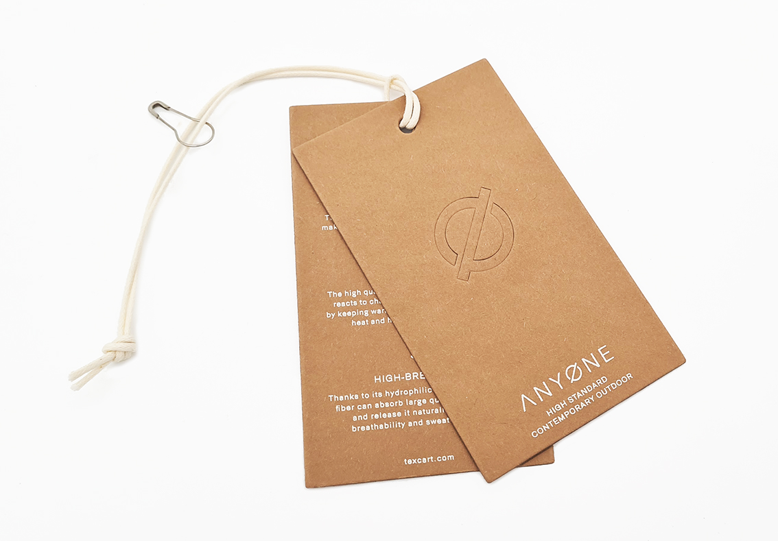 Paper tag col. tobacco made up of 2 parts, tone-on-tone dry embossed logo. Threaded with waxed cotton string col. cream
