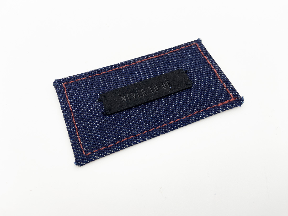 Denim base label and microfiber patch application with tone-on-tone logo