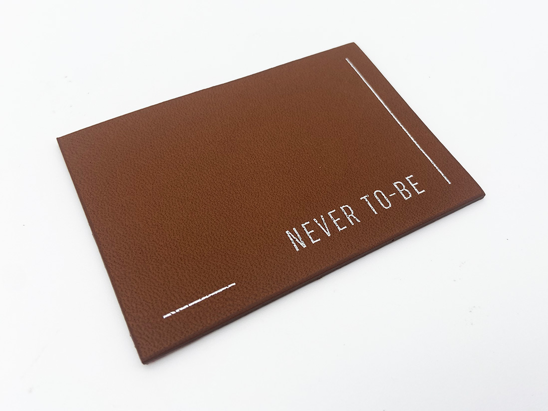 Leather label with embossed print with silver foil and edge dye