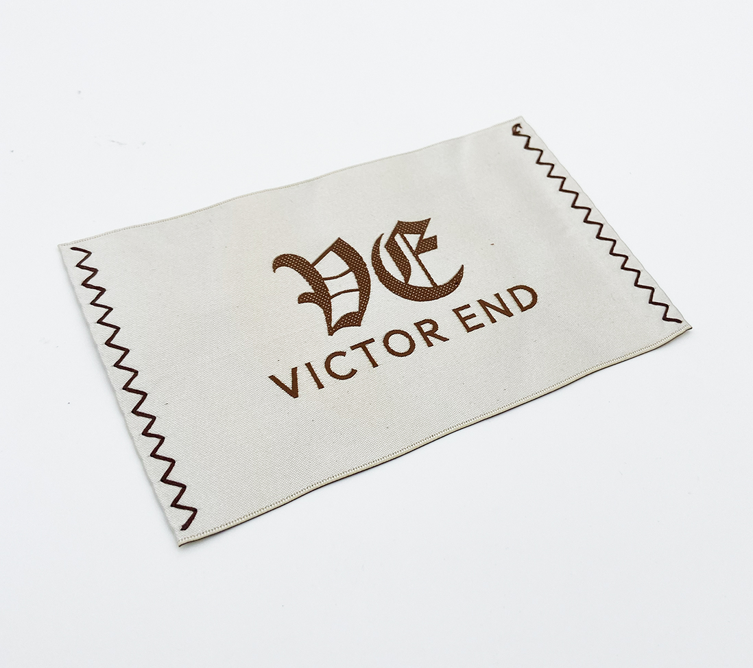 Etichetta tessuta su raso, tessitura effetto vintage ricamo zig/zag ai due lati