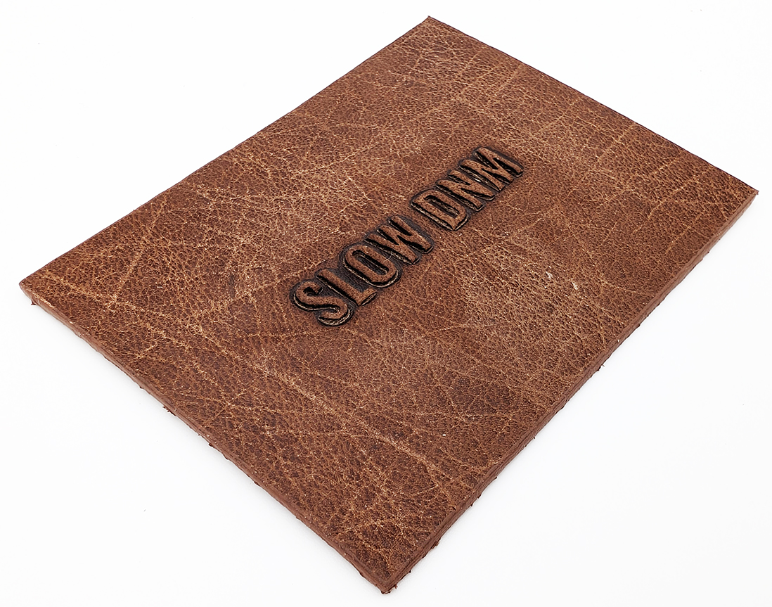 Leather label with tone-on-tone embossed elephant logo