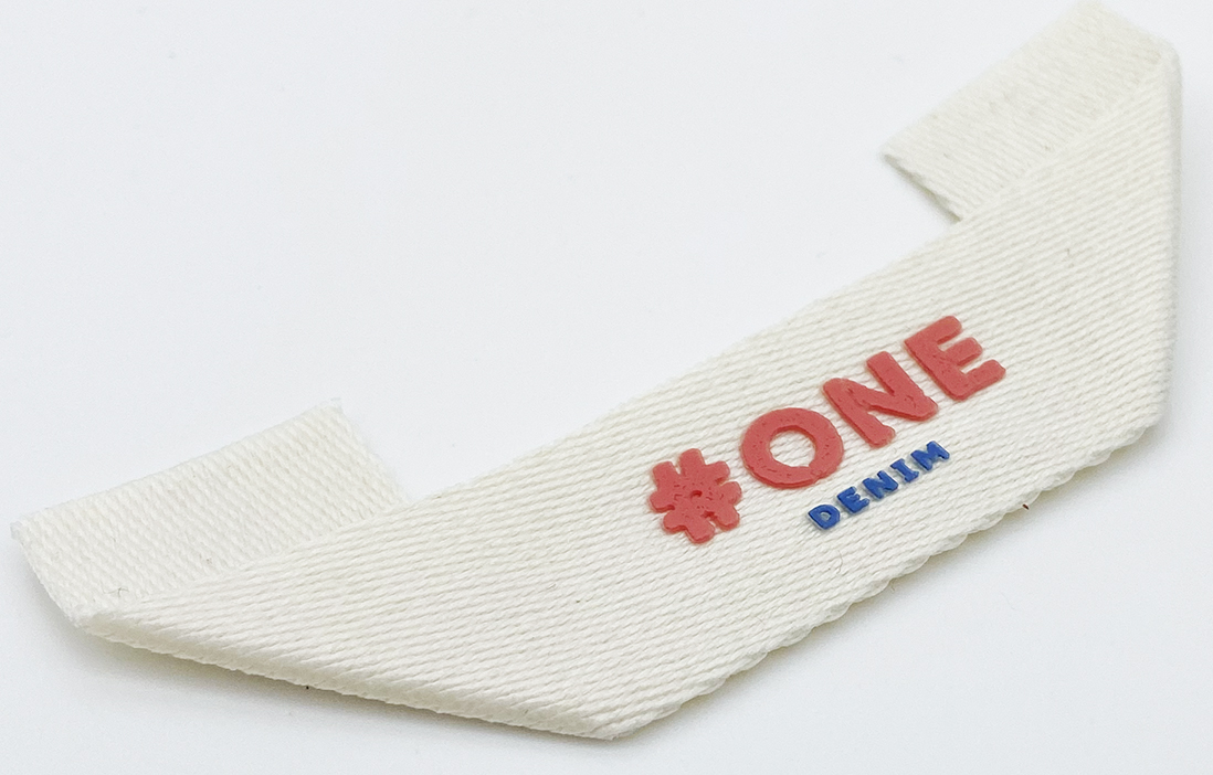 Miter label on cotton ribbon, thick screen-printed logo