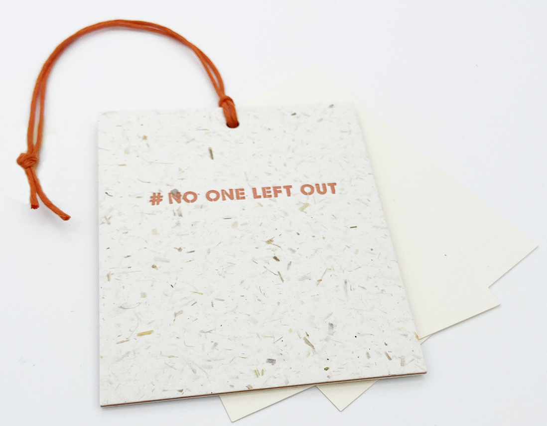 Cartellino principale realizzato con carta vegetale ottenuta con gli scarti del grano certificata FSC
