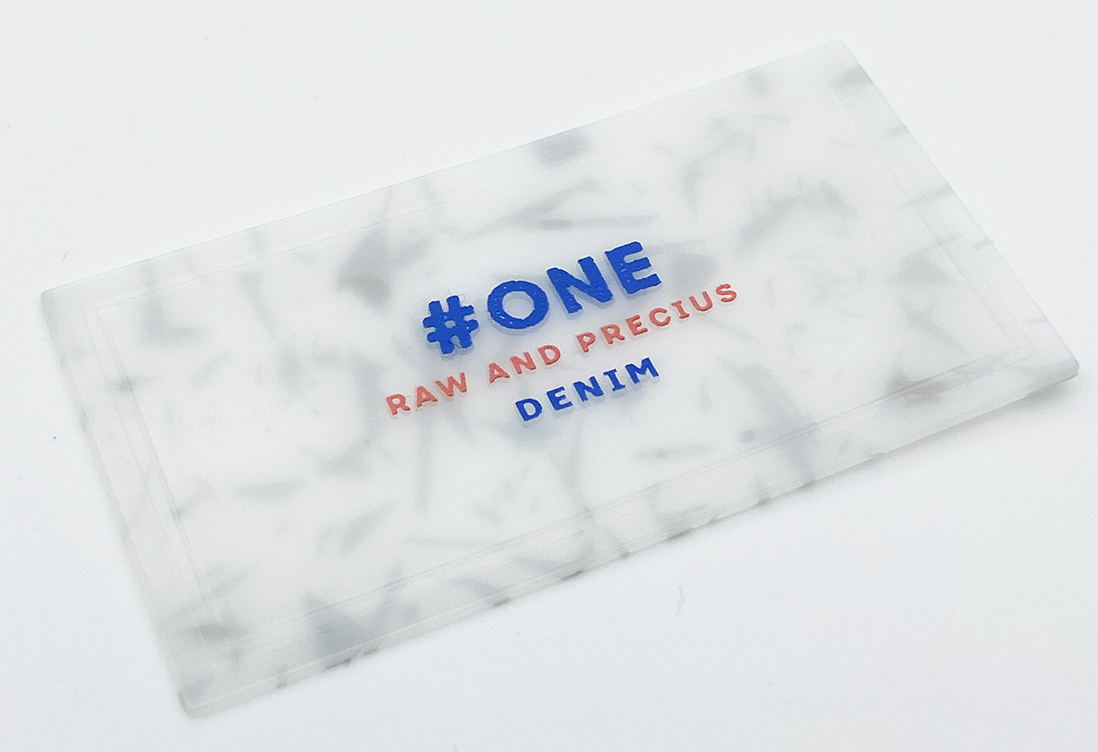Etichetta in PVC con effetto marmorizzato stampato sul retro, logo a rilievo in silicone cornice schiacciata in HF