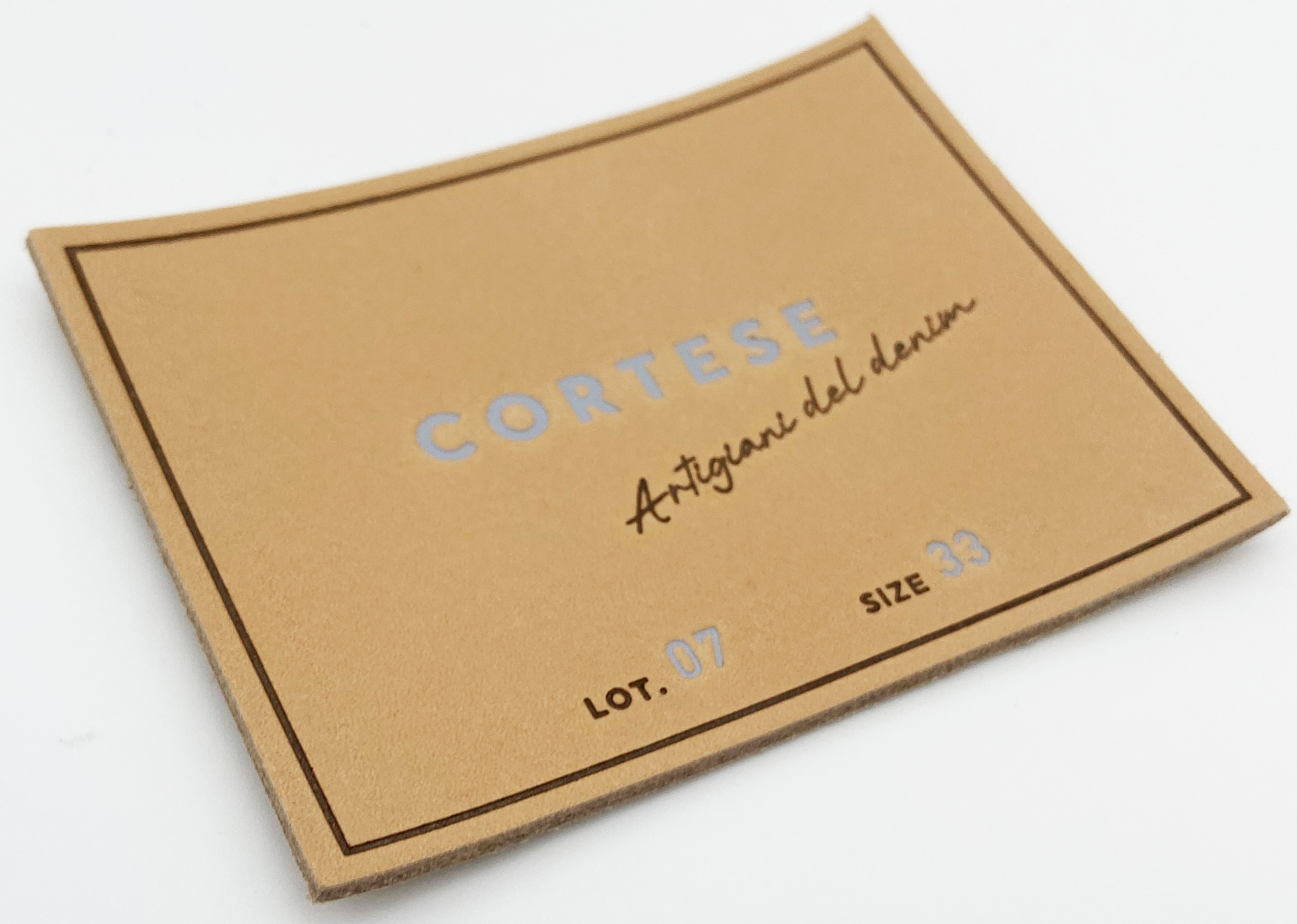 Faux vegetable-tanned leather label with heat-embossed lettering and edge-dyed screen printing