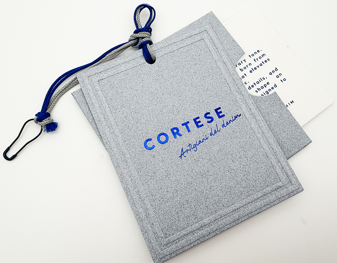 Cartellino principale + bustina su carta riciclata ricavata dagli scarti del denim, logo stampa a caldo con foil blu elettrico