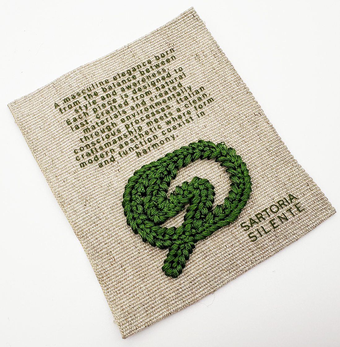 Printed and embroidered label, linen/cotton base, raised cross-stitch embroidery, silicone micro-injection lettering