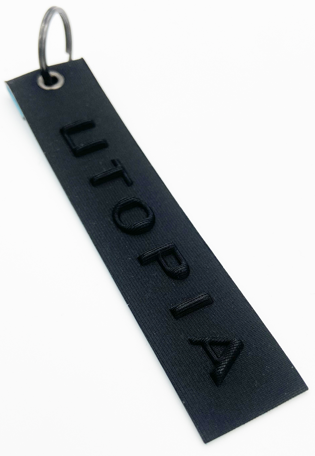 Black Lycra zipper puller, backed with light blue Lycra, featuring a tone-on-tone HF embossed design with sections of varying thicknesses.