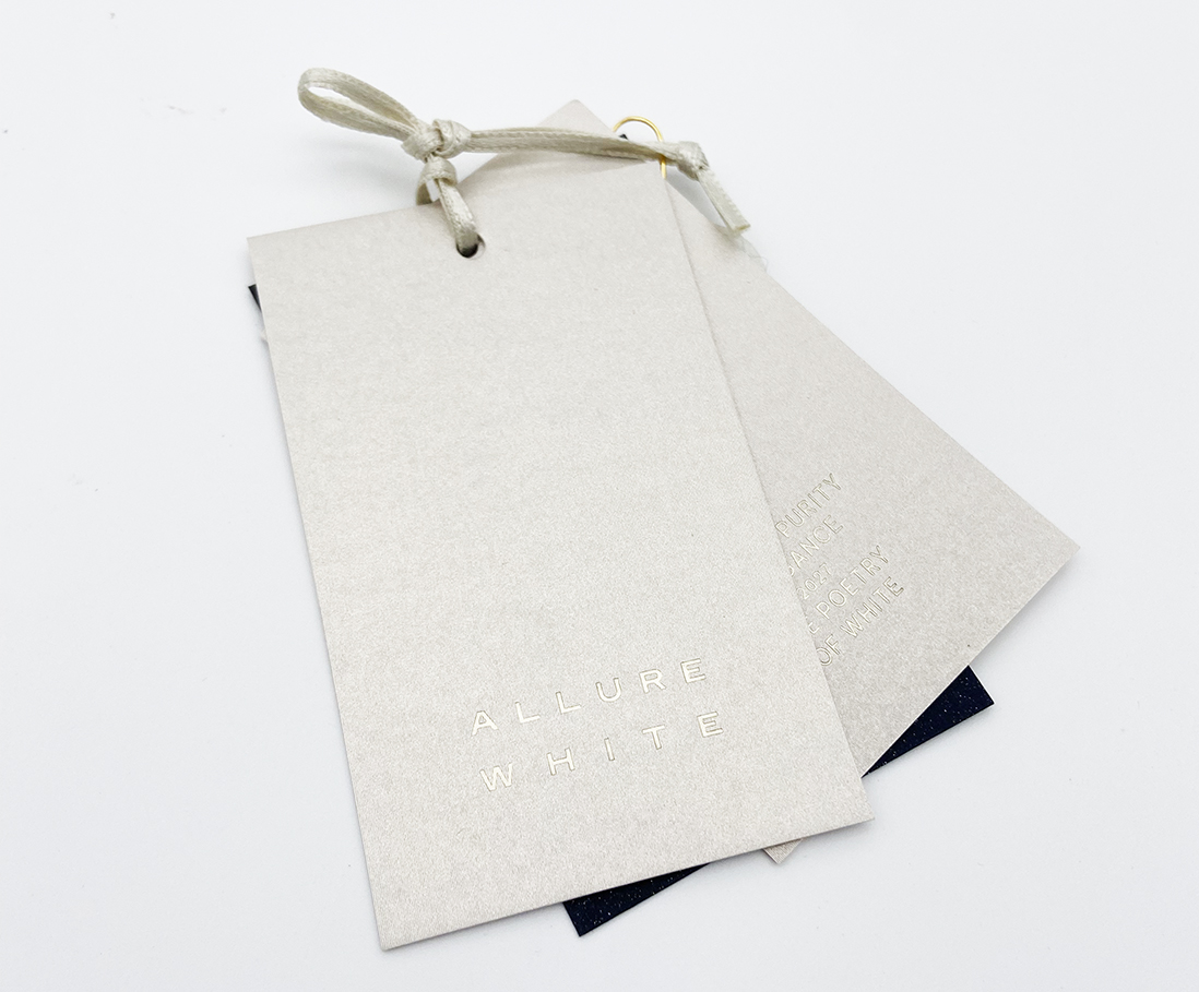 Main and secondary tag on pearlescent paper with matching hot stamping.