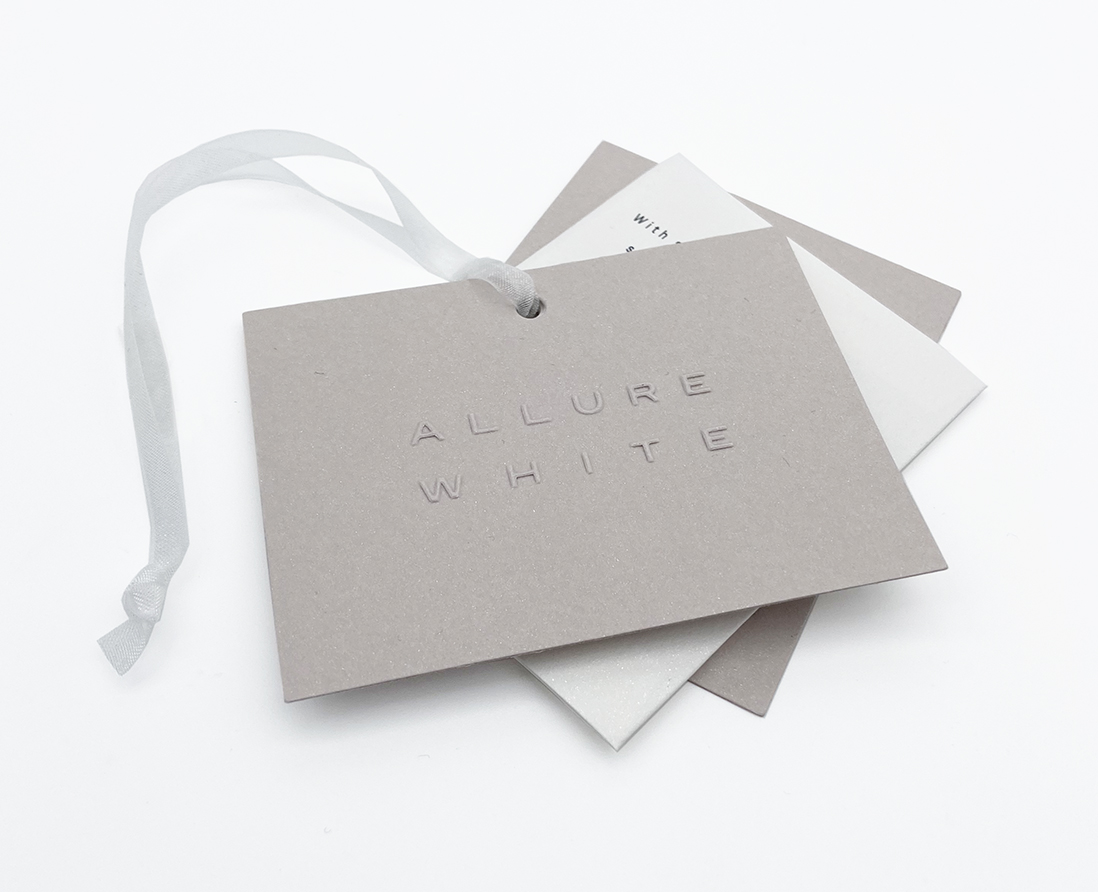Tag + envelope in two-tone pearlescent paper, with embossed tone-on-tone logo on the main tag.