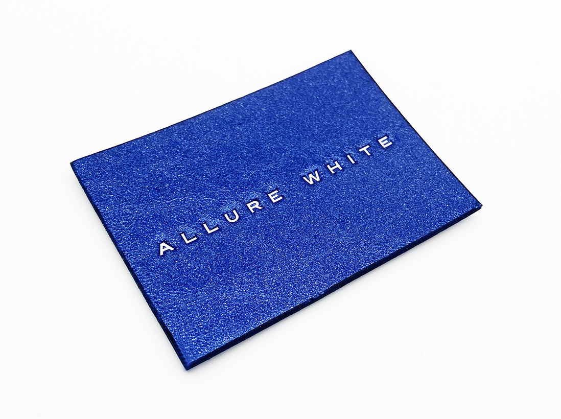 Metallic-effect faux leather label, flat screen print in white, with matching edge dye.