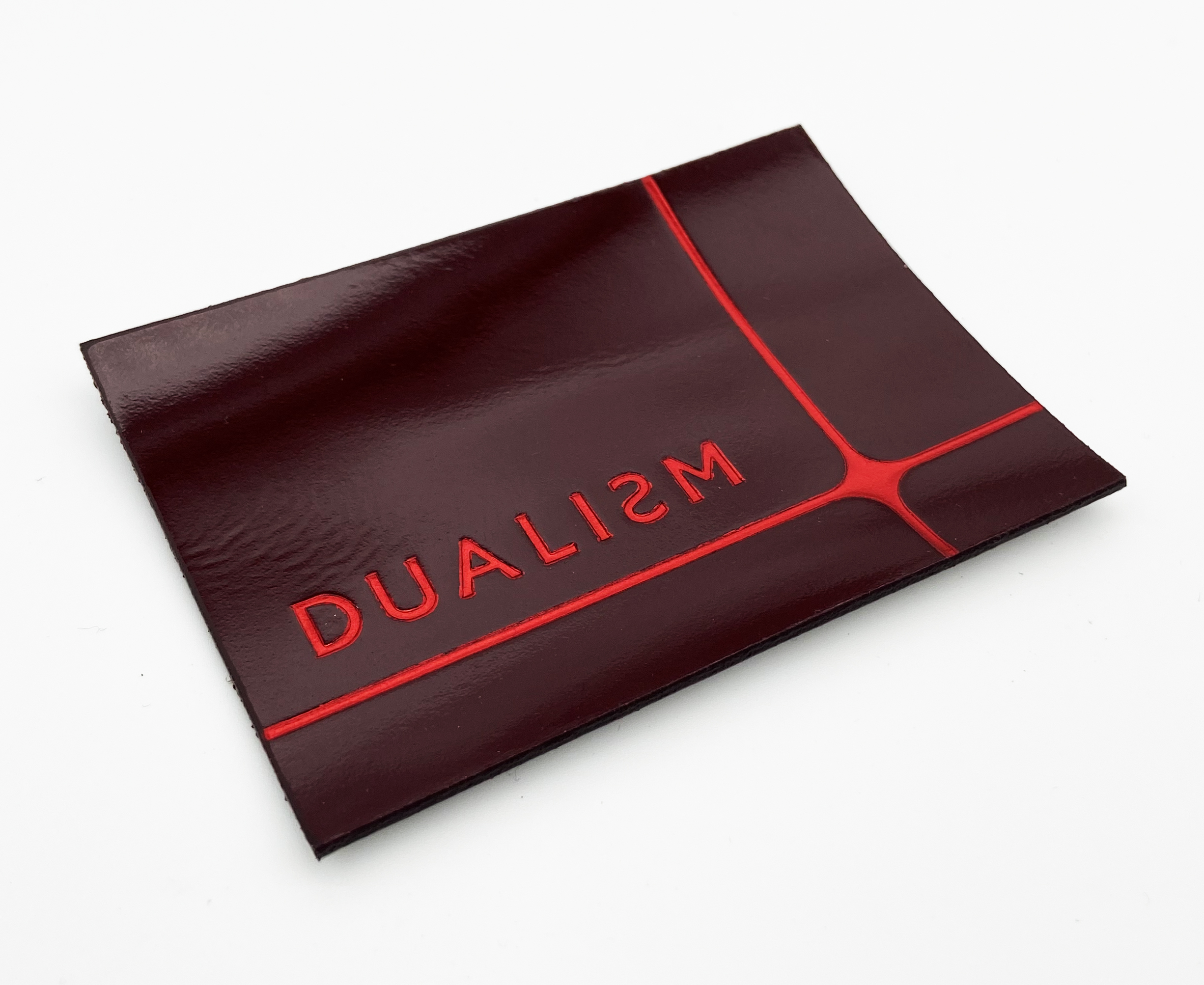 Glossy patent leather label with hot stamping and red foil, edge dyed