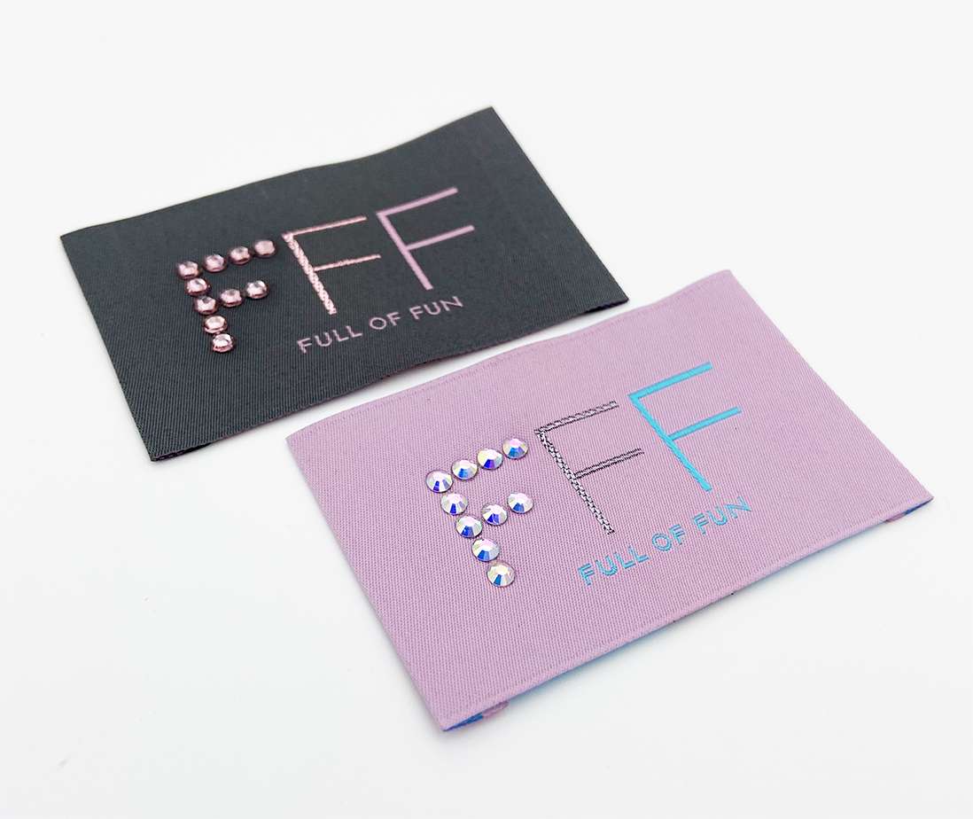 HD woven labels with rhinestone appliqués