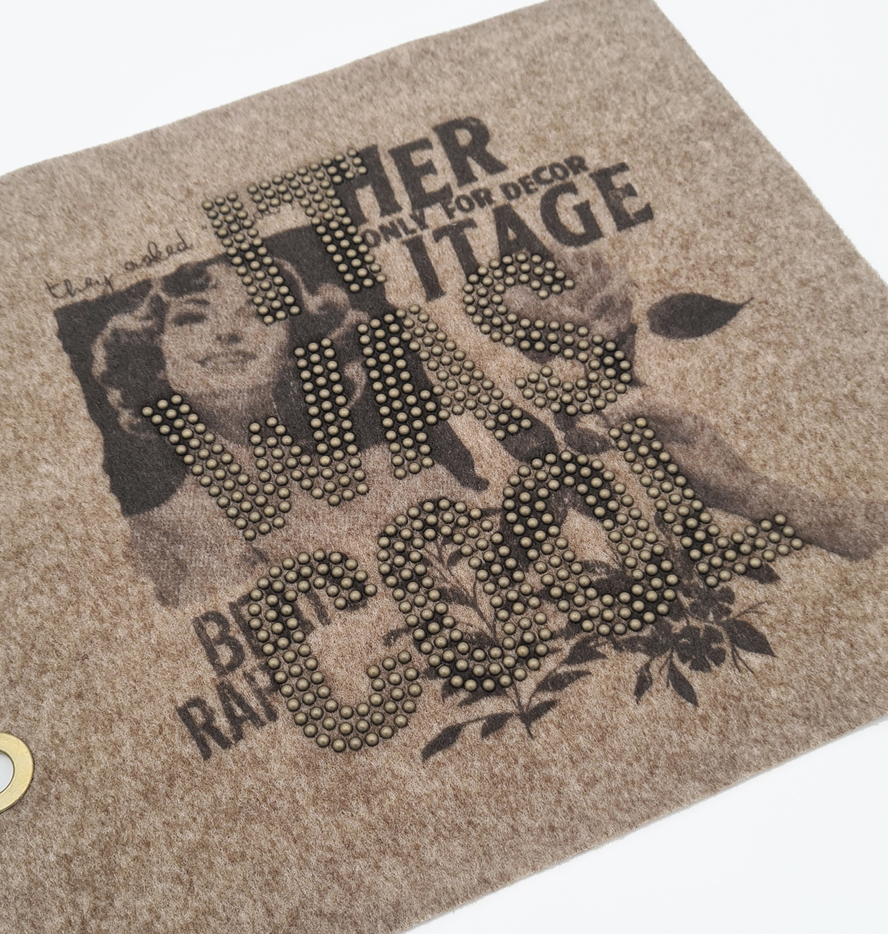 Stampa serigrafica digitale con applicazione di borchie a cupola in col. bronzo antico