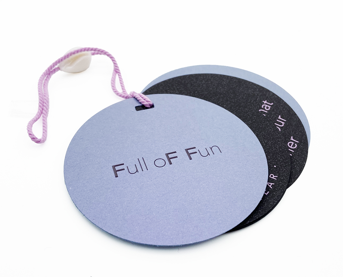 Tag + envelope on iridescent paper with thickened gloss UV printing, inserted with a shell-shaped seal