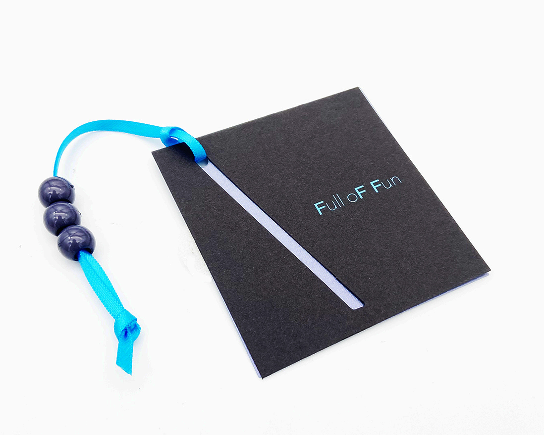 Cartellino di servizio su carta cangiante, stampa UV lucido spessorato infilatura con 3 perline